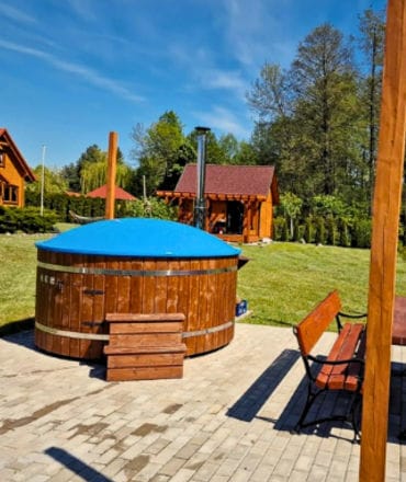 Prywatna strefa relaksu tuż przy domkach. Gorące jacuzzi na świeżym powietrzu.
